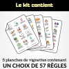 - 5 planches de vignettes contenant un choix de 57 règles à découper et à coller sur les planches vierges + 2 séries de jours de la semaines à découper et à coller sur les vignettes correspondantes.